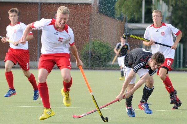 12.07.2014 - Auch das zweite Spiel im Rahmen des Deutsch-Polnischen Jugendwerks in Hamburg-Norderstedt konnten die deutschen A-Jugendlichen gegen die polnischen Junioren gewinnen. Aber im Gegensatz zum 8:1 am Freitag war es am Samstag eine ganz enge Kiste. Der Siegtreffer zum 4:3 fiel zehn Sekunden vor Abpfiff, zur Halbzeit war die DHB-Auswahl noch mit 1:3 in Rückstand gelegen. „Das war heute ein Sieg der charakterlichen Stärke“, fand Bundestrainer André Henning die Aufholjagd bemerkenswert.