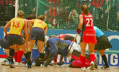 dha - Vergebene Torchancen im Dutzendpack brachten ein bis dato sehr überzeugendes deutsches Damenteam im Halbfinale um die mögliche Titelverteidigung. Bei einem Chancenverhältnis von 10:1 hätte die deutsche Damenmannschaft die Spanierinnen vom Platz schießen müssen, aber das Tor der Iberer schien wie vernagelt. Wer auch immer sich am Torschuss versuchte, scheiterte an den eigenen Nerven oder an einer exzellenten Torhüterin. Dass drei der vier spanischen Tore von Fehlern der völlig überforderten Schiedsrichterinnen aus den Niederlanden und Italien begünstigt wurden, kann nicht als Ausrede gelten. Was stehen bleibt, ist der zweite internationale Hallentitel nach der Europameisterschaft 1996 in Glasgow, den das deutsche Damenteam wird nicht gewinnen können.